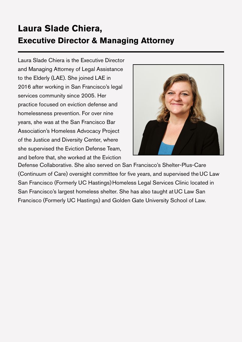 LAE’s mission is to protect and advance the right of San Francisco’s seniors and adults with disabilities to be housed, healthy, financially stable, and safe. When eviction, elder abuse, problems with benefits or creditors threaten, LAE is the lifeline.